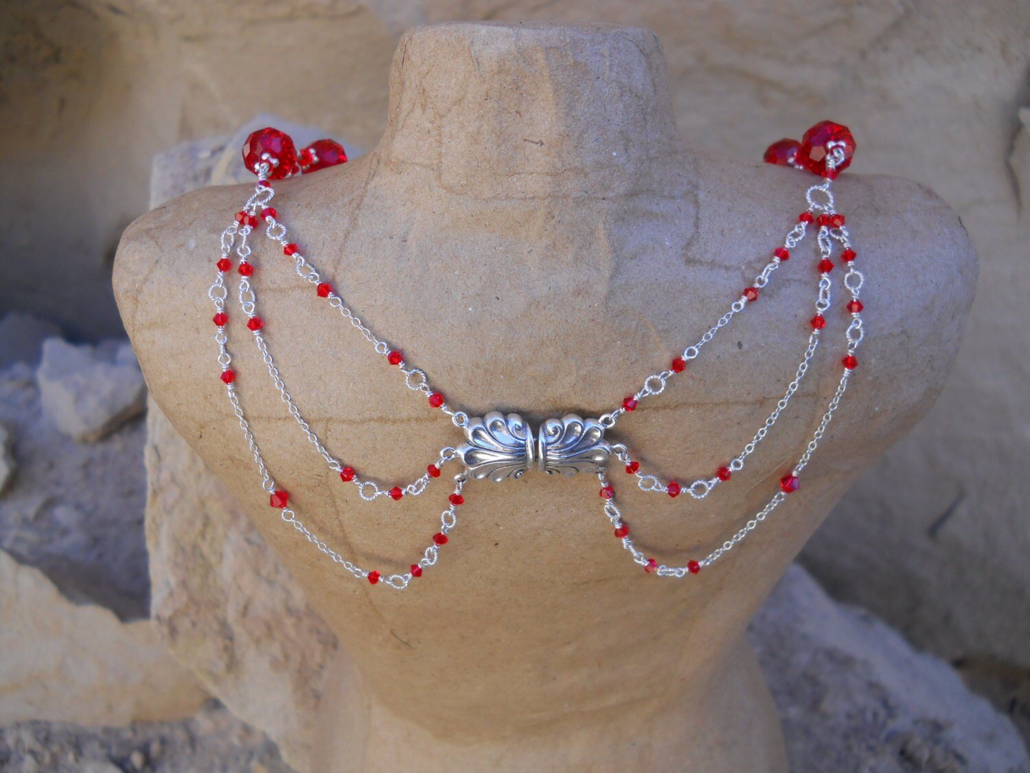 Original product name: Sterling Silver and Blood Ruby Red Swarovski Three Strand Victorian Fantasy Cosplay Steampunk Goth Necklace With Sterling Butterfly Clasp
