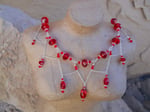 Hand-made with sterling silver wire, chain, beads, and clasp, Siam Red Swarovski crystal and hand cut Czech crystal beads. This necklace is weighted to be a choker in the front and drape down the nape of the neck in the back. The drops in the front hang delicately from chains and catch the light as you move. This is a one of a kind dramatic show piece that will make you the center of attention!